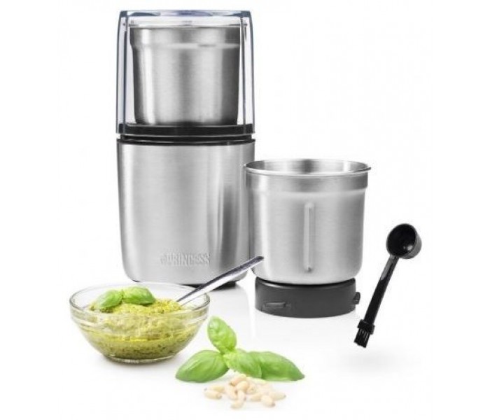 La multipicadora y molinillo Princess incluye dos recipientes y cuchillas para ingredientes secos y húmedos. Las cuchillas para moler se pueden utilizar con granos de café o especias para conseguir mezclas aromáticas. El recipiente para picar cuenta con cuatro cuchillas que pican finamente o a trozos más grandes (según el tiempo durante el que esté la picadora en funcionamiento) ajo, verduras y hierbas frescas. Ideal para preparar pesto, aceite con hierbas y pasta de curry caseros.