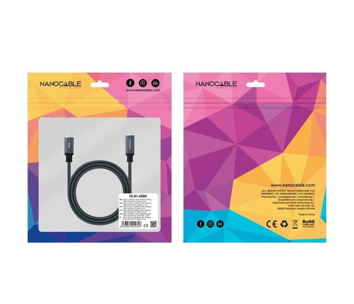 Cable prolongador USB-C 3.2 Gen2x2 20Gbp 100W/5A con conector tipo USB-C macho en un extremo y hembra en el otro.