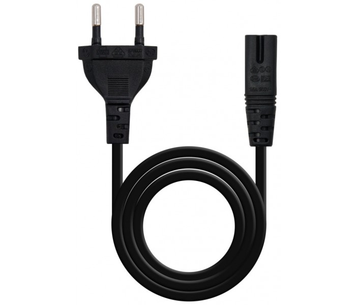 Cable de alimentación con forma 8 para cargar portátiles, equipos audiovisuales, consolas, y otros dispositivos electrónicos de baja potencia (consumo inferior a 1500W). Fabricado con conductor 100% cobre de AWG18.