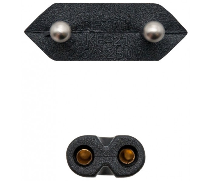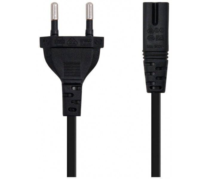 Cable de alimentación con forma 8 para cargar portátiles, equipos audiovisuales, consolas, y otros dispositivos electrónicos de baja potencia (consumo inferior a 1500W). Fabricado con conductor 100% cobre de AWG18.