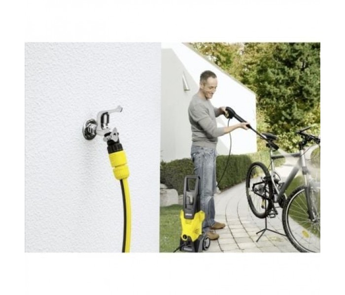 Con la hidrolimpiadora K3 podrás decir adiós a la suciedad superficial. La hidrolimpiadora está equipada con una pistola con Quick Connect y 6 m de manguera de alta presión, por lo que es idónea para usos ocasionales en el hogar y se encarga de obtener unas superficies relucientes tanto en bicicletas como en vallas y motocicletas. La lanza Vario Power (VPS) permite regular la presión del agua de forma muy sencilla, con un simple giro, para adaptarla a la superficie. La boquilla turbo con chorro giratorio disuelve incluso la suciedad más resistente. La bomba queda protegida en el «K3» mediante un filtro de agua, lo que aumenta su vida útil.