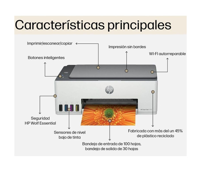 La HP Smart Tank 5105 es una impresora multifunción de inyección térmica de tinta diseñada para usuarios que buscan una solución económica y eficiente para imprimir, copiar y escanear en el hogar o en pequeñas oficinas. Con un sistema de tanques de tinta recargables, ofrece un bajo coste por página y una alta capacidad de impresión. Su conectividad Wi-Fi y compatibilidad con la aplicación HP Smart permiten una gestión sencilla desde dispositivos móviles.
