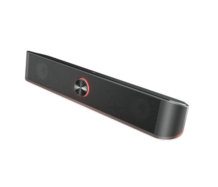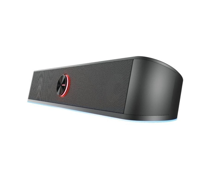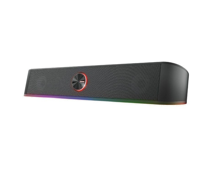 Barra de sonido estéreo con iluminación RGB y un diseño que ahorra espacio.