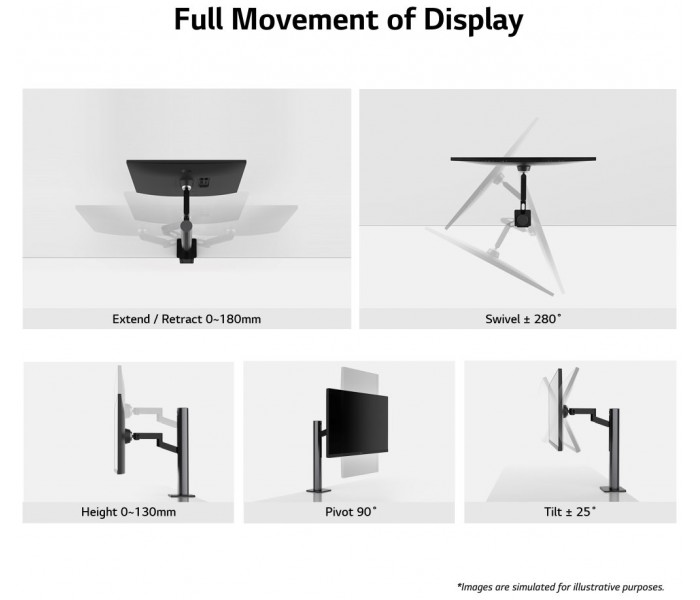 El soporte Ergo es una innovación bienvenida para aquellos que pasan una cantidad significativa de tiempo frente al escritorio. El soporte avanzado tecnológicamente y ergonómicamente de LG ayuda a promover una buena postura gracias a su alto grado de ajuste, permitiendo a cada usuario crear un espacio de trabajo perfectamente personalizado.