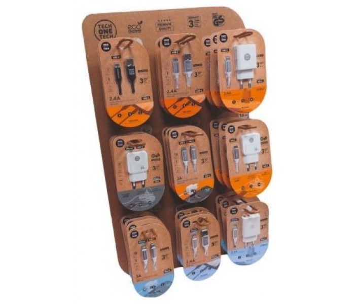 Elegante expositor de peana TECH ONE TECH, con 9 ganchos y 3 productos en cada gancho, total 27 productos de cargadores y cables más vendidos.