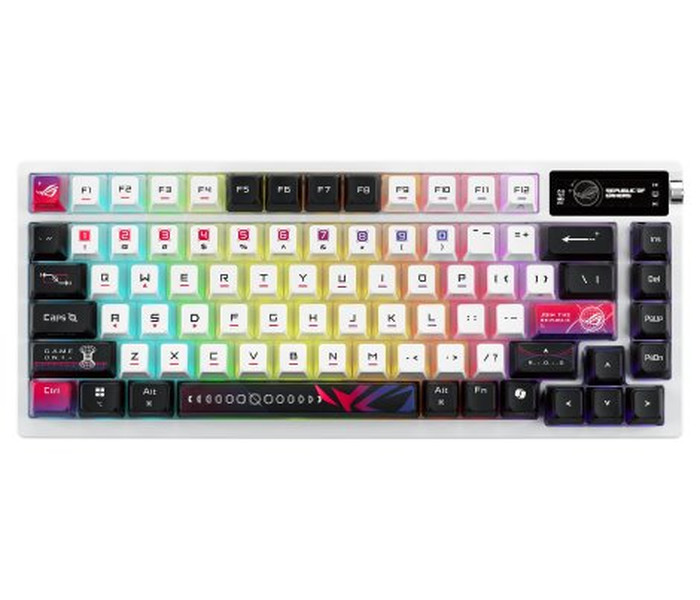 Teclado para juegos ROG Azoth X 75% personalizado con interruptores mecánicos ROG NX V2 intercambiables en caliente, teclas sublimadas y semitranslúcidas, cubierta superior de metal, montaje de junta, espuma amortiguadora de cinco capas, placa de posicionamiento FR4, PCB orientada al sur, conexión de tres modos con tecnología SpeedNova de 2,4 GHz, pantalla OLED, perilla de control de tres vías, reposamuñecas, tres ángulos de inclinación y compatibilidad con Mac