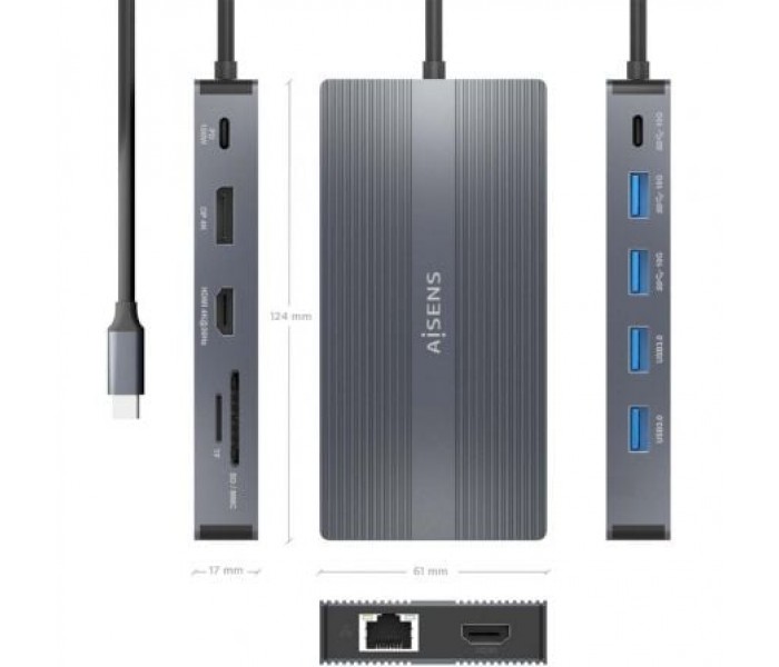 Conversor USB-C a 2xHDMI, 1xDISPLAYPORT SST MST, 1xRJ45, 2xUSB-A 5G, 2xUSB-A 10G, 1xUSB-C 10G, 1xUSB-C PD 100W, 1xLector de tarjeta SD, 1xLector de tarjeta MICRO SDEste producto multi función incorpora carcasa de aluminio con lo cual es muy ligero, de tamaño muy reducido, diseño moderno y fácil de transportar.Es excelente para conectar accesorios de expansión a ordenadores con interfaz USB-C.Convierta su portátil en una potente estación de trabajo esté donde esté.Conecte 3 pantallas a la vez a través de los puertos HDMI y DISPLAYPORT con una resolución de hasta 1920x1080@60Hz, alimente un portátil o tablet mediante el puerto USB-C PD hasta 100W, el puerto Ethernet le permite acceder de forma fiable a una red por cable, conecte el ratón, teclado, disco duro externo, etc. y alimente su smartphone, lector de libro electrónico, etc. utilizando los puertos USB tipo A o USB-C, también puede leer tarjetas de memoria.¡Nunca más tendrá que llevar varios adaptadores monofunción!