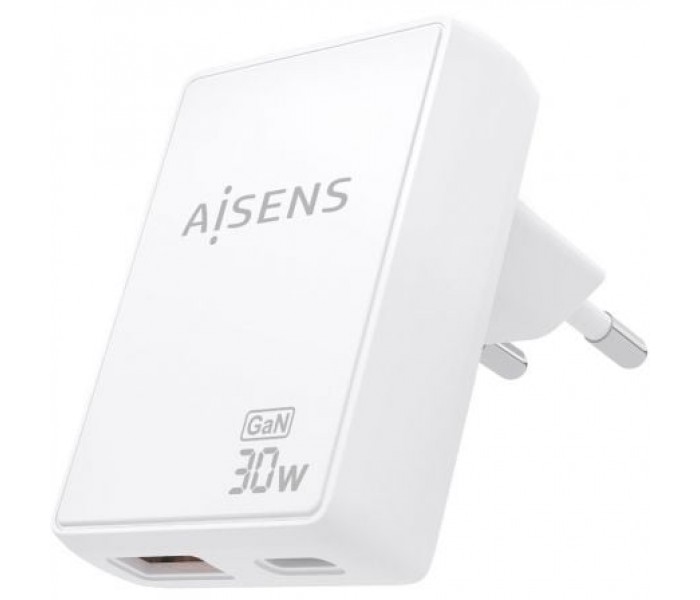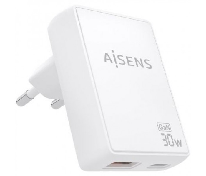 CARGADOR DE PARED GaN ULTRA DELGADO 30W, 1xUSB-C PD3.0 QC4.0, 1xUSB-A QC3.0, BLANCO