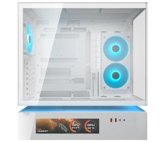 | Otras características | - Compatibilidad placas base: Mini ITX / Micro ATX / ATX / CEB - Longitud máxima GPU: 400 mm - Altura máxima disipador CPU: 175 mm - Longitud máxima PSU: 200 mm - Conector: 5V 3 pines ARGB / 4 pines PWM - Soporte refrigeración líquida superior: 360 mm / 280 mm / 240 mm / 140 mm / 120 mm - Soporte refrigeración líquida trasera: 120 mm Expansion - 7 x ranuras de expansión Diseño - Panel frontal Mesh - Pantalla LCD integrada 9,16" (1920 x 462 px) - Iluminación ARGB integrada Puertos - 1 x USB 3.2 Gen 2x2 Tipo C - 2 x USB 3.0 Tipo A - 1 x Jack de audio 4 polos Sistema Ventilación - Soporte frontal: 2 x 160 mm - Soporte superior: 3 x 120 mm / 2 x 140 mm - Soporte inferior: 3 x 120 mm - Soporte trasero: 1 x 120 mm - Ventiladores preinstalados frontales: 2 x 160 mm ARGB PWM - Ventilador preinstalado inferior: 1 x Unity 360 ARGB PWM Reversed - Ventilador preinstalado trasero: 1 x 120 mm ARGB PWM - Número máximo de ventiladores: 9 - Velocidad ventiladores 160 mm: 500-1.200 RPM ±10% - Velocidad ventiladores Unity 360: 700-1.600 RPM ±10% - Velocidad ventiladores 120 mm: 500-1.400 RPM ±10% Dimensiones - 235 x 493 x 460 mm |