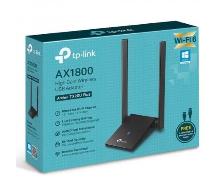 Tecnología Wi-Fi 6. videos impecables con velocidades inalámbricas de 1800 Mbps, 1201 Mbps en 5 GHz + 574 Mbps en 2.4 GHz. (1). Wi-FI de Doble Banda. Actualiza tu PC con la mejor conexión gracias a las bandas de 5GHz y 2,4GHz. 2 Antenas de alta ganancia. Consigue una conexión estable desde más lejos y de alta calidad. Tecnología MU-MIMO. Altas velocidades de carga y descarga incluso con varios dispositivos conectados a la vez.(2). Tecnología OFDMA. Baja latencia para disfrutar del gaming y las vdeollamadas también en redes saturadas. (2). USB 3.0 de alta velocidad. Transferencias de datos hasta 10 veces más rápidas que con USB 2.0. Seguridad avanzada. Protección y privacidad con el último cifrado WPA3. . Características:. . Wi-Fi 6 de Doble Banda. Ya no hace falta comprar un PC nuevo. Con el adaptador Wi-Fi USB TX20U Plus puedes actualizar tu PC para hacerlo compatible con la tecnología Wi-Fi 6 de doble banda y con una velocidad de hasta 1800 Mbps.. . Conexiones rápidas sin cortes con Beamforming. Las 2 antenas de alta ganancia, compatibles con la tecnología Beamforming, concentran las señales Wi-Fi hacia el router para mejorar la recepción de la señal y la estabilidad de la conexión.. El router debe ser compatible con la tecnología Beamforming. . Mayor cobertura y velocidad con MU-MIMO. Con la tecnología MU-MIMO tu PC podrá recibir directamente la señal del router compatible para sacar el mejor rendimiento de tu conexión a internet incluso con varios dispositivos conectados a la vez.. . Menor tiempo de respuesta con OFDMA. Archer TX20U Plus recibe datos desde el router compatible con OFDMA al mismo tiempo que otros dispositivos conectados a la vez, reduciendo al mínimo el lag, ideal para videojuegos online.. . Conexión USB 3.0 Ultrarrápida. La conectividad USB 3.0 garantiza la máxima velocidad de transmisión entre el adaptador Wi-Fi 6 TX20U Plus y el PC.. . Antenas Orientables 180º. Encuentra el ángulo perfecto para obtener la mejor recepción de señal Wi-Fi para tu PC.. . Especificaciones:.