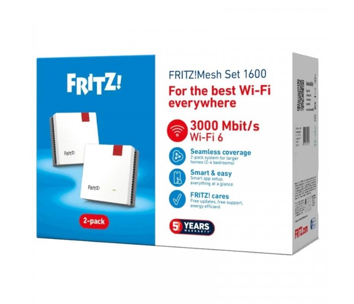 | Características | - Repetidor inalámbrico de alto rendimiento - Compatible con FRITZ!Box, otros routers o conexión directa a módem de fibra / ONT - Sistema Mesh Wi?Fi - Programación Wi?Fi - Red Wi?Fi de invitados - Conexión mediante WPS - Pantalla con estado y calidad de conexión - Interfaz de gestión vía navegador y app - Consumo medio 6 W Compatibilidad - Compatible con routers Wi?Fi IEEE 802.11a/g/n/ac/ax Dimensiones y peso - 80 × 80 × 37 mm (sin cabeza de enchufe) Contenido - 2 x FRITZ!Repeater 1200 AX |