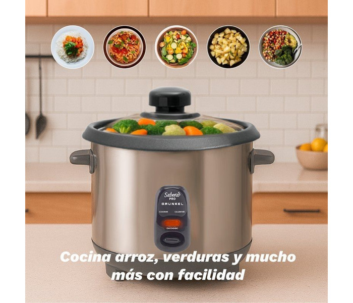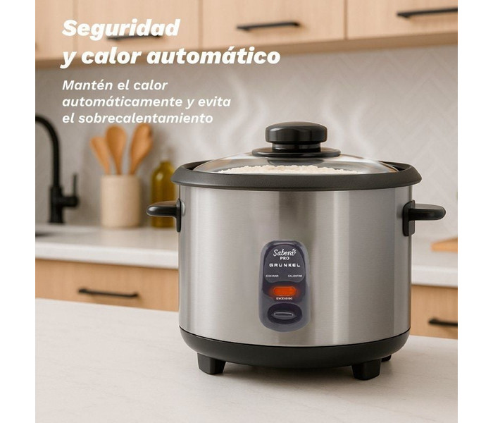 La arrocera de GRUNKEL RC-28L posee gran capacidad, ideal para familias o preparaciones abundantes. Con 2,8 litros de capacidad y 1000W de potencia, cocina arroz y otros cereales de forma rápida, sin complicaciones ni necesidad de supervisión constante. Una vez finalizada la cocción, activa automáticamente la función mantener calor, manteniendo la comida caliente y lista para servir en cualquier momento. Su cubeta interior antiadherente es extraíble y fácil de limpiar, lo que mejora la experiencia de uso. La carcasa exterior de acero inoxidable le da un acabado resistente, elegante y duradero. Además, cuenta con indicadores luminosos para saber en qué estado está (cocinar o mantener caliente) y una tapa de cristal transparente que permite vigilar el proceso sin levantarla. La arrocera RC-28L es práctica, eficiente y perfecta para cocinar arroz con el punto justo sin esfuerzo.Especificaciones