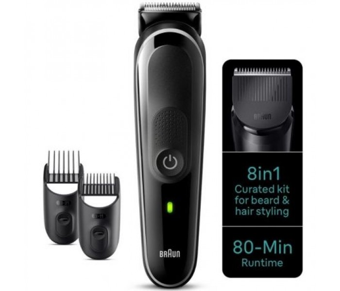 Recortadora 8 en 1 de Braun para afeitado de pies a cabeza, contiene accesorios especiales para barba, nariz y orejas, y recorte de pelo en casa. Tu estilo sin esfuerzo en casa, barba, pelo, nariz y orejas, lámina ultra afilada para un afeitado sin esfuerzo en cada pasada y 80 minutos de autonomía inalámbrica.