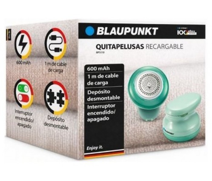 Quitapelusas Blaupunkt BP5018BP5018 Quitapelusas recargableBlaupunkt BP5018 es un quitapelusas recargable para ropa y tapiceríascon depósito desmontable, tapa protectora, interruptor ON/OFF ypuerto de carga USB. Funciona con batería Ni-MH de 2,4 V (2×600mAh) e incluye cable de carga de 1 m para un u..
