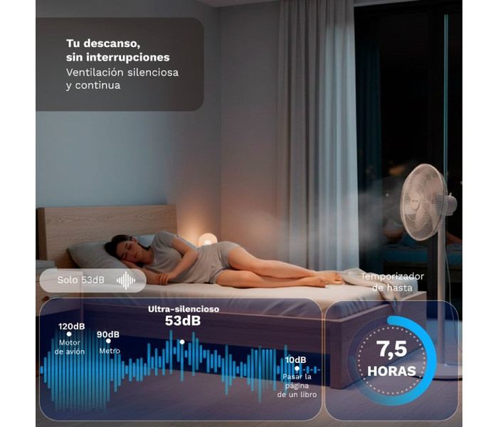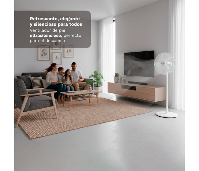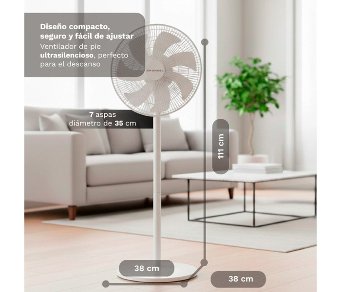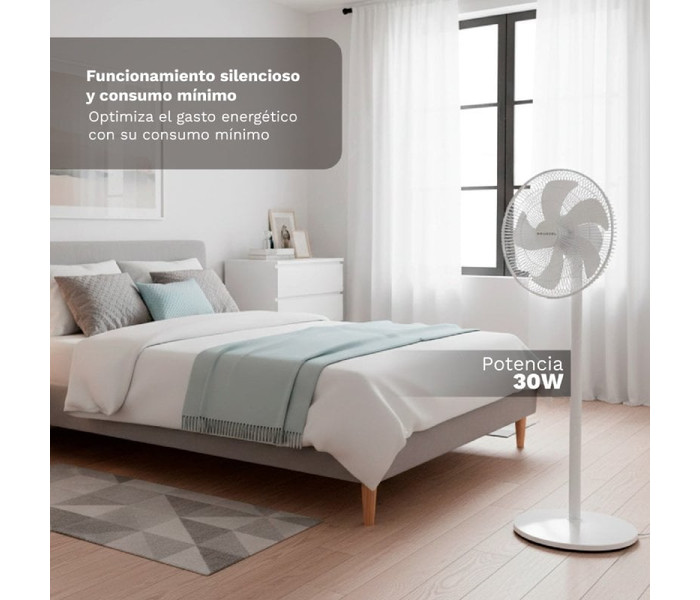 El ventilador de pie silencioso GRUNKEL FS-14PR está diseñado para ofrecer un alto nivel de confort con una ventilación potente y estable, ideal para dormitorios, salones o espacios de trabajo donde el silencio es importante. Gracias a su motor eficiente de 30W, proporciona un rendimiento óptimo con un consumo energético reducido. Incorpora 7 aspas de 35 cm (14 pulgadas) que generan un flujo de aire uniforme, constante y más potente, mejorando la sensación de frescor en toda la estancia. Su diseño optimizado permite disfrutar de una ventilación eficaz manteniendo un bajo nivel sonoro, perfecto para el descanso nocturno. Dispone de 12 niveles de velocidad, lo que permite ajustar con precisión la intensidad del aire según cada momento del día. Además, cuenta con 3 modos de funcionamiento: modo Normal para uso continuo, modo Natural que simula una brisa más suave y modo Sueño que reduce progresivamente la velocidad para favorecer el descanso. El ventilador incluye oscilación electrónica de 100°, que mejora la distribución del aire en toda la habitación, y una inclinación manual de 30°, permitiendo dirigir el flujo de aire de forma más precisa. También incorpora un temporizador programable de hasta 12 horas, que permite controlar el tiempo de uso y mejorar la eficiencia energética. Gracias a su mando a distancia, podrás controlar todas sus funciones cómodamente sin necesidad de desplazarte. Su base redonda de 36 cm aporta estabilidad y seguridad durante el uso, mientras que su diseño moderno en color blanco se integra fácilmente en cualquier estancia. Una opción eficiente, silenciosa y potente para disfrutar de un ambiente fresco con total comodidad.Especificaciones