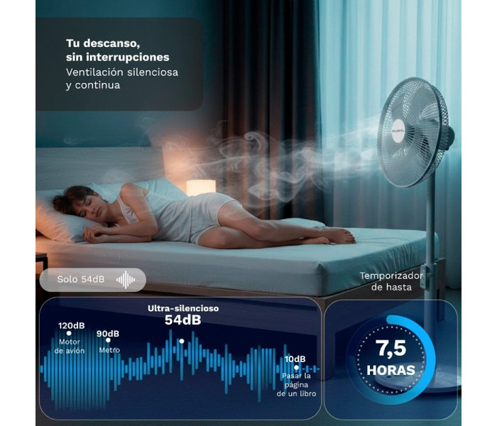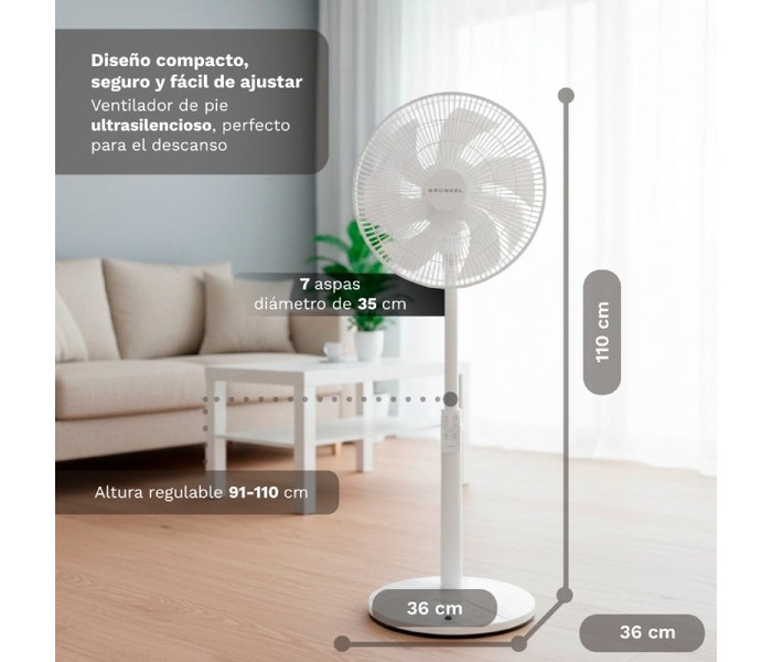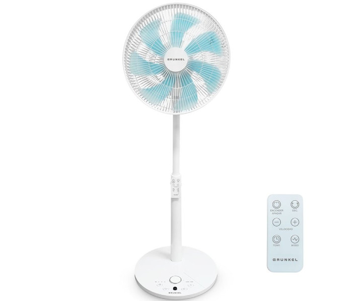 El ventilador de pie GRUNKEL FS-14T está diseñado para ofrecer un alto nivel de confort con un funcionamiento ultrasilencioso, ideal para dormitorios, oficinas o cualquier espacio donde se busque frescor sin ruidos molestos. Gracias a su motor de 25W de bajo consumo, combina eficiencia energética con un rendimiento óptimo para el uso diario. Incorpora 7 aspas de 35 cm (14 pulgadas) que generan un flujo de aire más uniforme, constante y potente, mejorando la sensación de frescor en toda la estancia. Su diseño está optimizado para ofrecer una ventilación eficaz con un nivel sonoro reducido, perfecto para el descanso nocturno. Dispone de 12 niveles de velocidad, lo que permite ajustar con precisión la intensidad del aire según cada momento. Además, incluye 3 modos de funcionamiento: modo Normal para uso continuo, modo Natural que simula una brisa suave y modo Sueño que reduce progresivamente la velocidad para favorecer el descanso. El ventilador cuenta con oscilación electrónica de 100°, que distribuye el aire de forma uniforme, y una inclinación manual de 30°, permitiendo dirigir el flujo de aire hacia donde se necesite. Incluye temporizador programable de hasta 7,5 horas para controlar el tiempo de uso y optimizar el consumo energético. También dispone de mando a distancia, facilitando el control total del ventilador sin necesidad de moverse. Su diseño incorpora altura regulable de 91 a 110 cm y una base redonda de 36 cm, que proporciona estabilidad y un estilo moderno y funcional. Una solución potente, silenciosa y eficiente para disfrutar de un ambiente fresco y confortable en cualquier momento del día.Especificaciones