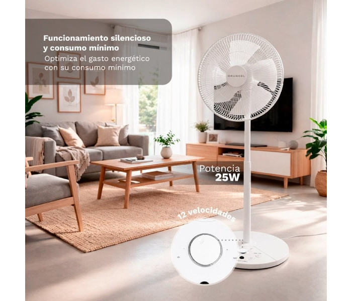 Ventilador GRUNKEL FS-14T ultrasilencioso de 25W con 12 velocidades, 3 modos, 7 aspas de 35 cm, oscilación electrónica 100°, temporizador 7,5h y mando a distancia.