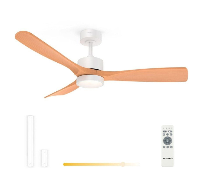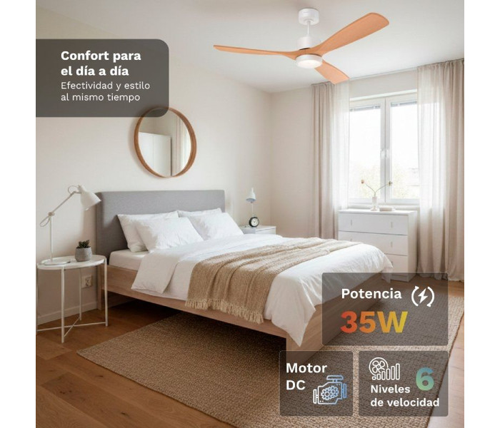 Ventilador de techo GRUNKEL SKYSTYLE52 de 52” con motor DC de 35W silencioso, 3 aspas efecto madera, 6 velocidades, rotación inversa, luz LED regulable 18W y mando a distancia.
