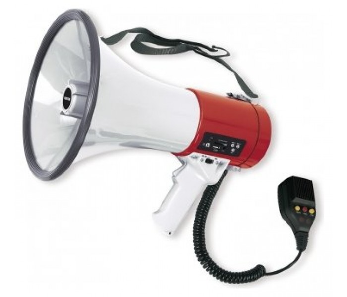 Megáfono portátil de 25 W máximo con sirena, reproductor USB/SD/MP3 y grabador de mensaje de 15 segundos.