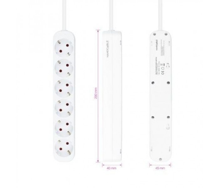 Regleta Nanocable 10.37.0006-NS-BK/ 6 Tomas de Corriente/ Cable 1.4m/ NegraEspecificación: 6 tomas de corriente con toma de tierra Protección infantil Voltaje: 250V-50Hz Máximo 3.680W Certificado CE, RoHS, GS y REACH Color: Negro Medidas del producto: 290x47x42 mm Contenido del paquete: 1..