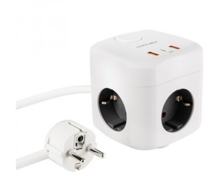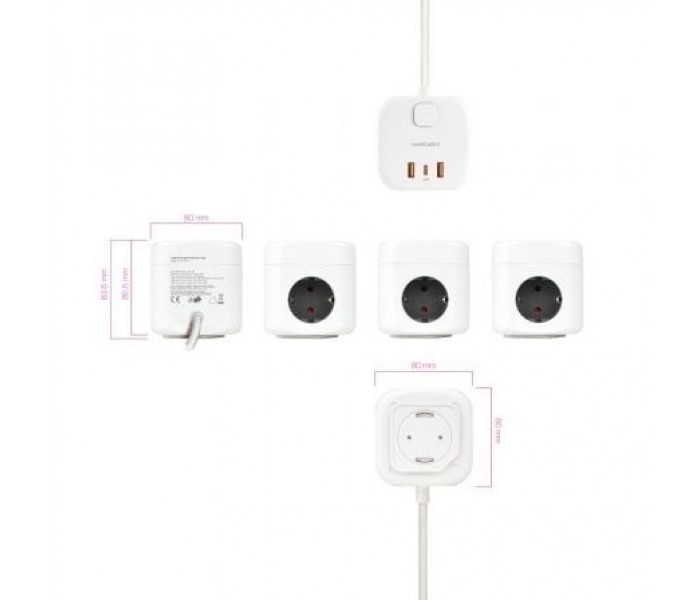 Regleta compacta en formato cubo con 3 enchufes de 16A y 3 puertos USB (2x USB-A + 1x USB-C).