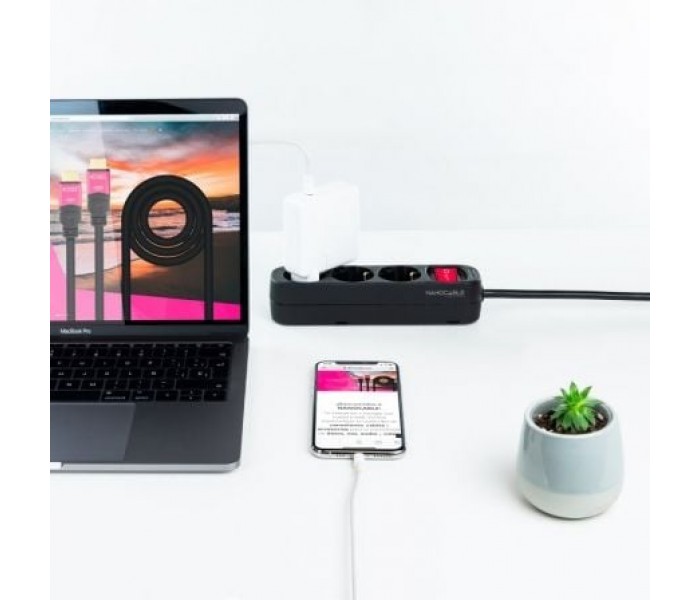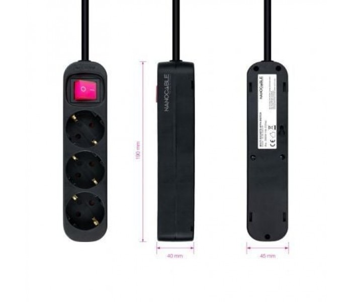 Nanocable presenta la familia perfecta de regletas para uso doméstico y profesional. Disponibles en blanco y negro, con tres, cuatro o seis enchufes. ¿A qué esperas para descubrirlas? . ¿Necesitas enchufar varios dispositivos?. Con nuestra regleta despreocúpate de no tener suficientes enchufes en tu habitación o despacho.. La regleta de Nanocable cuenta con un interruptor ON/OFF. Así podrás desconectar con seguridad todos tus equipos de la red eléctrica.. Elige la regleta perfecta para ti. ¡Además vienen en nuestra característica bolsa reutilizable de Nanocable!. . Especificaciones:. . 3 tomas de corriente con toma de tierra . Protección infantil. Voltaje: 250V-50Hz. Máximo 3.680W . Certificado CE, RoHS, GS y REACH. Color: Negro. Medidas del producto: 190x40x45 mm