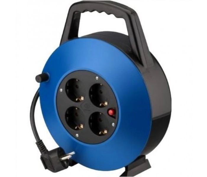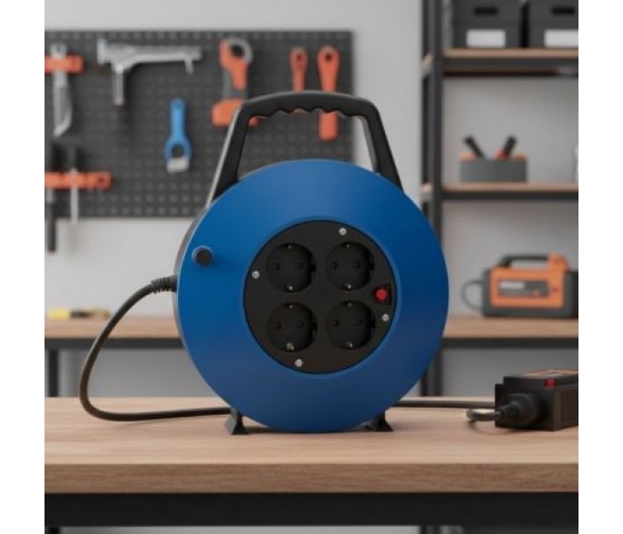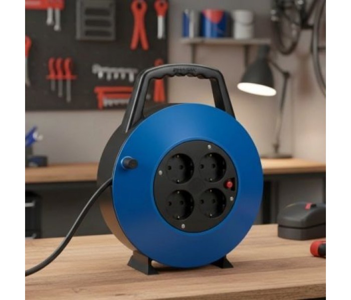 Regleta enrollable con 4 tomas Schuko, protección contra sobretensión y cable 10 m (H05VV-F 3G 1,5 mm²). Carcasa azul/negra con asa y recogida cómoda. 3000 W · 16 A · 230 V.