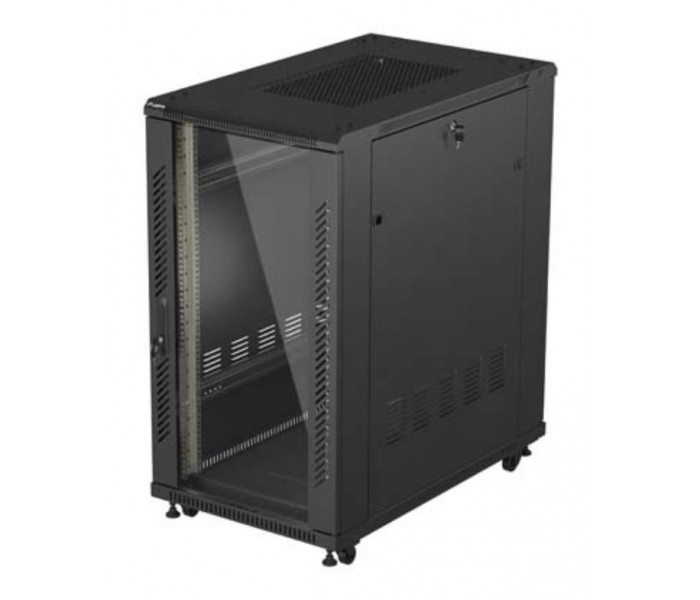 19""/18U/ Puerta cristal/ 800 x 600 x 977mmIdeal para baterías de Litio Enrackables para instalaciones solares (energía fotovoltaica). Instalación y mantenimiento sencillos. Incluye 2 guías de cableado verticales.. Incluye 4 ruedas con freno, pies regulables en altura, juego de llaves para cerradura..