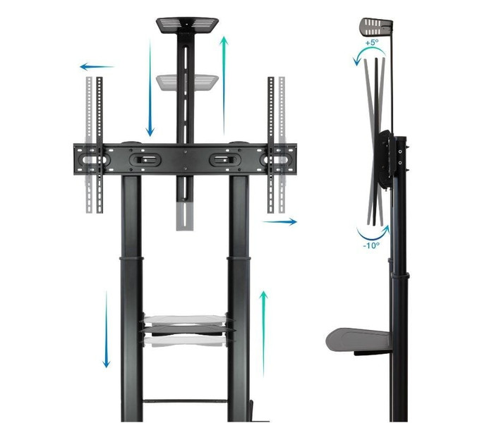 Soporte de Suelo Ajustable con Ruedas TooQ FS20105M-B para TV de 60-105"/ hasta 120kgFS20105M-B"OPTIMUS" Soporte de Suelo con Ruedas para Pantallas 60"-105", NegroEspecificacionesPantallas soportadas: 60"-105"Compatible con VESA: Mínimo 200x200. Máximo 1000x600Peso máximo soportado de pantalla: 120 ..
