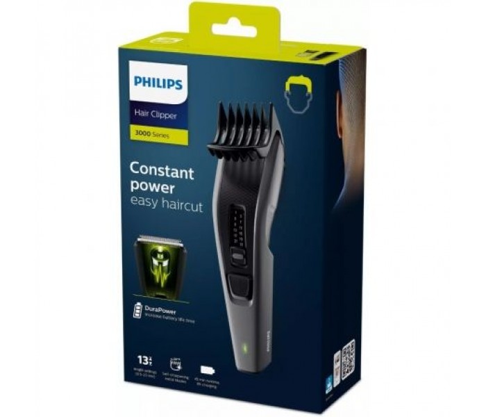 Con el cortapelos 3000, disfrutarás de un corte de pelo fácil, rápido y uniforme una y otra vez. La tecnologÃa DuraPower garantiza un rendimiento de la baterÃa duradero, mientras que las cuchillas de metal autoafilables permanecen tan afiladas como el primer dÃa sin lubricarlas. La tecnologÃa DuraPower reduce la fricción de las cuchillas, lo que evita que el motor y la baterÃa se sobrecarguen. De esta forma, la duración de la baterÃa del cortapelos aumenta. Las cuchillas metálicas autoafilables tienen una duración increÃblemente larga. Incluso después de 5 años, cortan justo como el primer dÃa. Solo tienes que seleccionar y bloquear la longitud que deseas. El peine-guÃa ajustable tiene 12 posiciones de longitud entre 1 mm y 23 mm, con una precisión de 2 mm entre cada longitud. Retira el peine-guÃa para un corte apurado de 0,5 mm. Tanto si tienes barba larga como si deseas tener una barba corta perfecta, solo tienes que colocar el peine-guÃa de barba ajustable y seleccionar una de las 12 posiciones, de 1 mm a 23 mm. Hay exactamente 2 mm entre cada longitud. Para obtener una barba más corta, retira el peine-guÃa para un corte apurado de 0,5 mm.