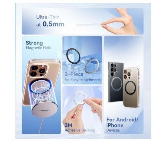 El paquete de 2 anillos adhesivos metálicos universales Vention (modelo: KQOB0) está diseñado como accesorio auxiliar para usar con soportes magnéticos para teléfonos, especialmente aquellos que utilizan tecnología de montaje magnético, como soportes magnéticos para teléfono de coche o bases de carga magnéticas. Cada paquete incluye dos anillos metálicos adhesivos delgados y duraderos, que permiten a los usuarios fijar uno a su dispositivo o funda para una mayor compatibilidad con accesorios magnéticos. Fabricados en metal de alta calidad con un fuerte reverso adhesivo, estos anillos ofrecen un montaje fiable, una fácil instalación y compatibilidad con una amplia variedad de smartphones, tablets y dispositivos electrónicos portátiles similares.