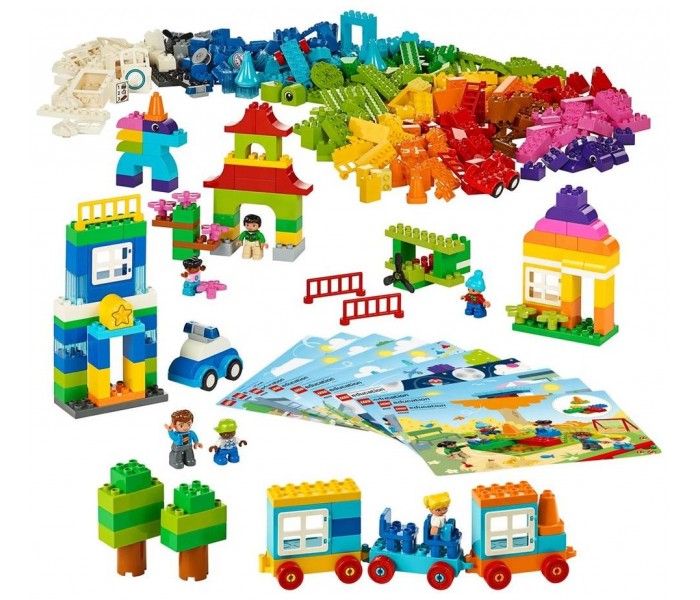 En grupos de 2-10, las niñas y niños usan la colorida colección de 480 ladrillos, figuras, bases de ruedas, ventanas, puertas y una placa de construcción LEGO DUPLO para construir una casa, un