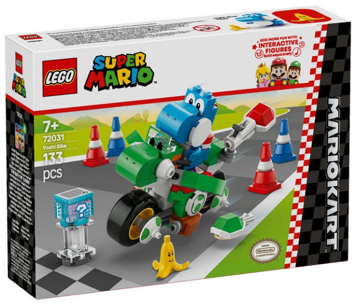 ¡Diviértete pilotando y sorteando obstáculos con el juego de juguetes Mario Kart?: Moto Yoshi LEGO® Super Mario? (72031)! Inspirado en la serie de Nintendo®, el set, un emocionante regalo para niños, niñas y jugadores a partir de 7 años, incluye un modelo construible de la Moto Yoshi y, por primera vez en un set LEGO Super Mario, una figura de Yoshi Azul Claro. Ayuda a Yoshi Azul Claro a zigzaguear entre los 4 conos de tráfico, lanzar caparazones desde la moto y esquivar el plátano.