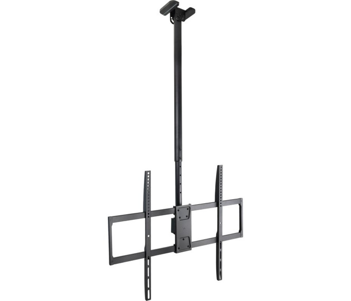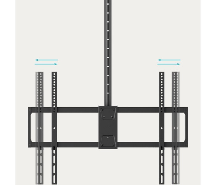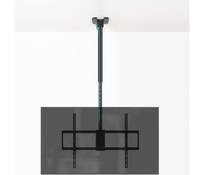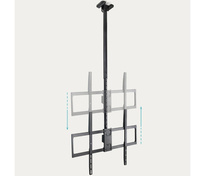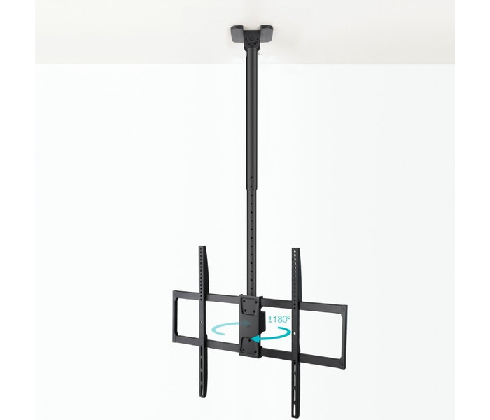 Soporte de techo extensible para pantallas de 50” a 100”, con hasta 13 posiciones de altura (1090–1690 mm) para una instalación totalmente adaptable. Ofrece giro de ±180° e inclinación de -25° para un ángulo de visión óptimo, soportando hasta 80 kg con total seguridad.