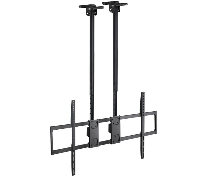 Soporte de techo extensible con doble mástil para pantallas de 60” a 120”, con capacidad de carga de hasta 120 kg. Permite inclinación de 0° a -25° y nivelación de ±1° para un ajuste óptimo del ángulo de visión. Distancia al techo regulable entre 1090 y 1690 mm, apto para techos inclinados (±60°), con sistema de gestión de cables y compatible con pantallas curvas.