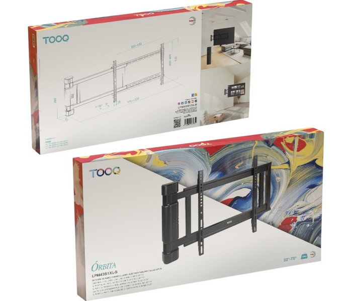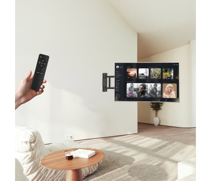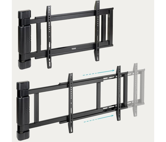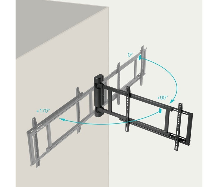 Soporte de pared eléctrico para pantallas de 32” a 75”, con regulación motorizada mediante mando a distancia y memoria para dos posiciones. Ofrece ajuste horizontal de hasta 1220 mm, giro de 0° a +170° y diseño ultrafino a solo 56 mm de la pared.