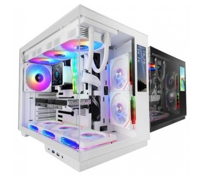 El frontal y el lateral en cristal templado continuo ofrecen una visión clara y envolvente del interior. Este diseño panorámico resalta cada componente y amplifica los efectos de iluminación ARGB, creando un espectáculo visual que une elegancia, creatividad y personalidad.