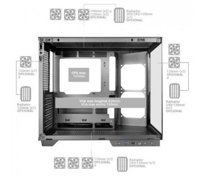 - Soporte refrigeración líquida: 360mm, 240mm, 120mm superior / 240mm, 120mm inferior / 240mm, 120mm interior / 120mm trasero