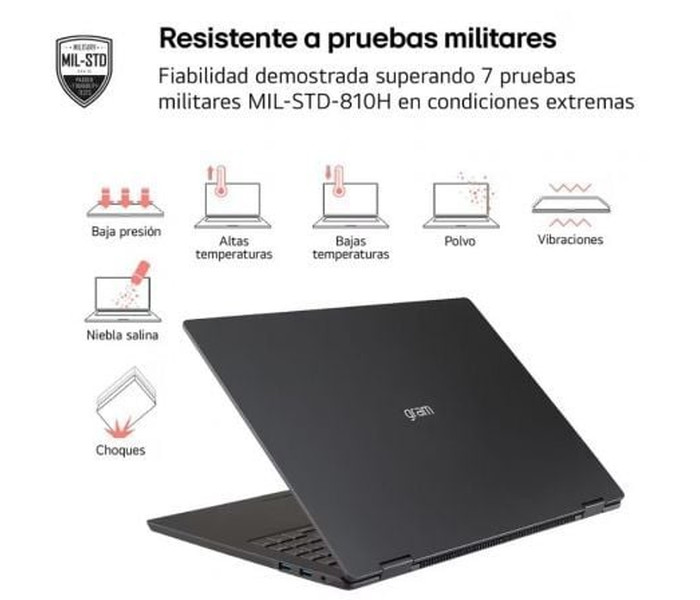 El chasis está fabricado en aleación de aluminio y cumple con el estándar MIL-STD-810H, superando 7 pruebas de resistencia a condiciones extremas. Su peso de apenas 1.120 g lo convierte en uno de los portátiles más ligeros del mercado en su categoría.