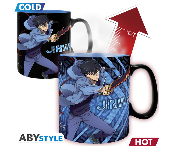 Sumérgete en el universo de Solo Leveling cada mañana con esta taza termosensible de Jinwoo e Igris, una pieza imprescindible para los fans del manhwa. Diseñada por ABYstyle, esta taza no solo destaca por su diseño exclusivo, sino también por su efecto térmico: el arte se transforma al contacto con bebidas calientes, revelando todo el poder del protagonista y su fiel comandante.
