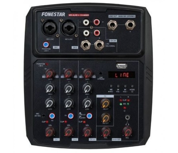 Mezclador estéreo de 4 canales con función live streaming, tarjeta de audio para PC y grabador/reproductor Bluetooth®/USB .