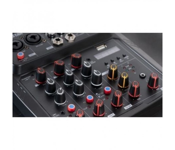 - Funciones: Ecualizador de 2 bandas por canal, indicador luminoso de exceso de señal y nivel de salida master, live streaming, USB/PC