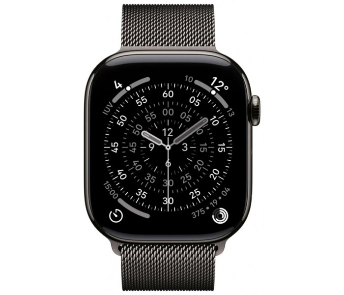 - Tamaño y peso: Alto: 46 mm, Ancho: 39 mm, Grosor: 9,7 mm, 416 x 496 píxeles, Superficie de pantalla de 1.220 mm², Peso (aluminio, GPS): 37,8 g, Peso (aluminio, GPS + Cellular): 36,9 g, Peso (titanio): 43,1 g, Para muñecas de 140 a 245 mm
