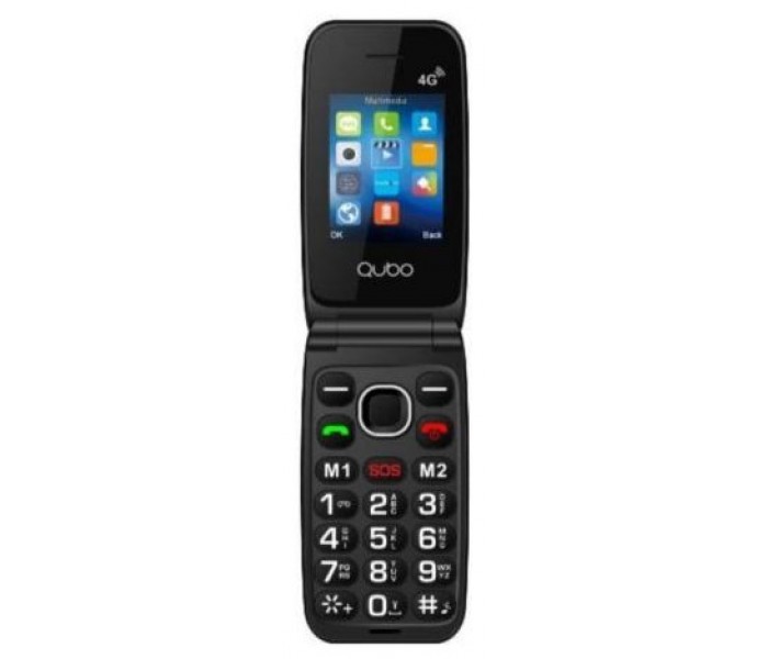 Teléfono Móvil Qubo X-209 4G para Personas Mayores/ NegroX-209 4GEspecificacionesDisplay TFT LCDPantalla 2,4″ QVGAChipset – M76261DACPU ARM7, 260MhzRAM 32Mb + ROM 32MbBluetooth 3.0Batería 1000 MahConectividad : 4G GSM 900/1800Wsdma 900/1200 Lte B1/3/7/20Internet, FacebookCamara : 0,3 MpFm Radio, Dua..
