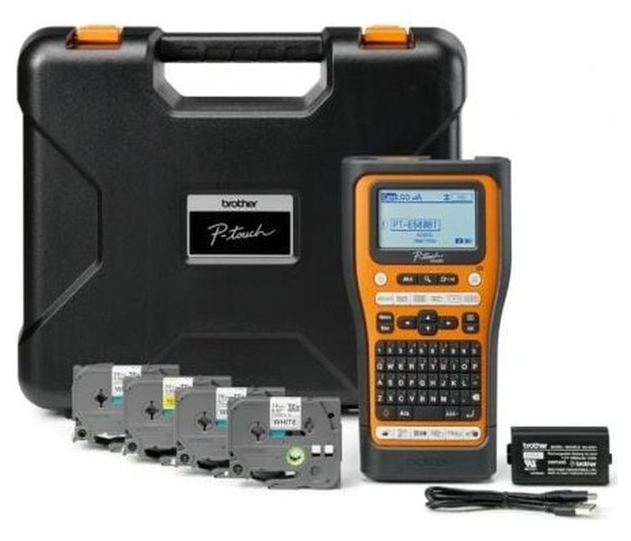 - Máquina PT-E560BT, batería recargable de ion litio, cable USB Tipo-C (1m, negro), 1x cinta laminada súper adhesiva de18mm negro sobre blanco/ 1x cinta laminada súper adhesiva de 24mm negro sobre blanca/1x cinta laminada súper adhesiva de 24mm negro sobre fondo amarillo/1x cinta laminada flexible de 12mm negro sobre fondo blanco; documentación, maletín de transporte
