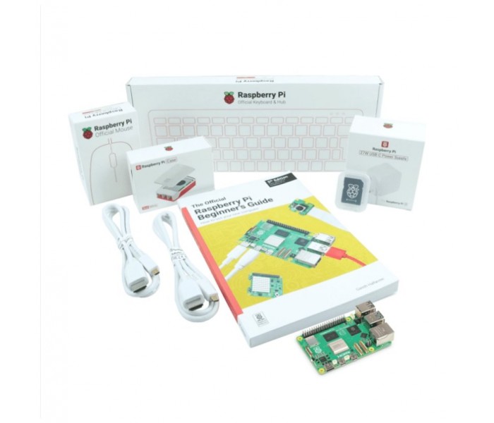 Varios accesorios oficiales incluidos: fuente de alimentación dedicada de 27W, teclado, ratón, tarjeta precargada 32GBSD, 2 cables Micro-HDMI a HDMI, y la guía oficial Raspberry Pi para principiantes (5ª edición)
