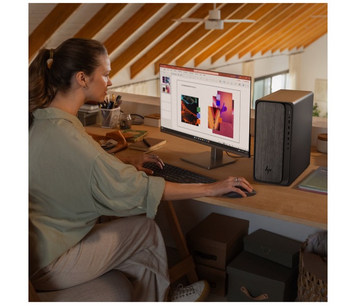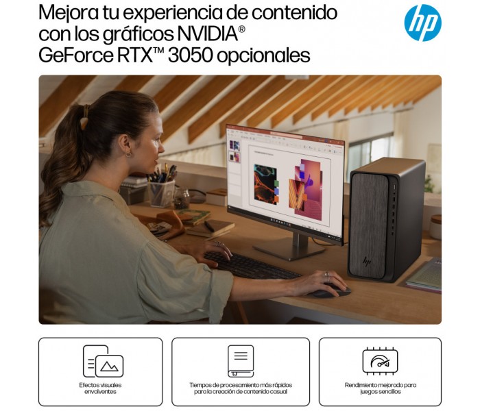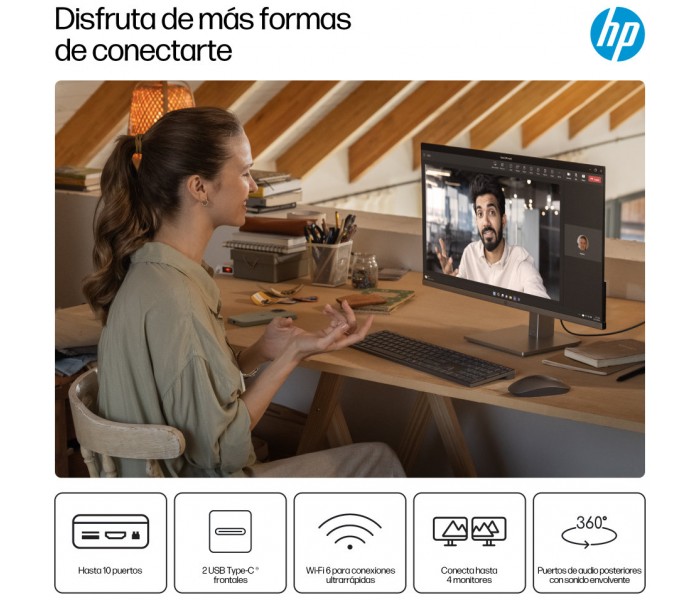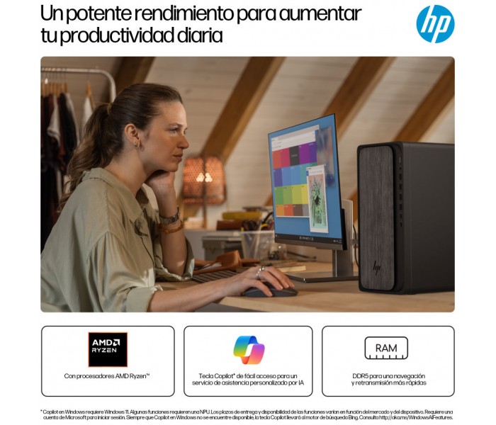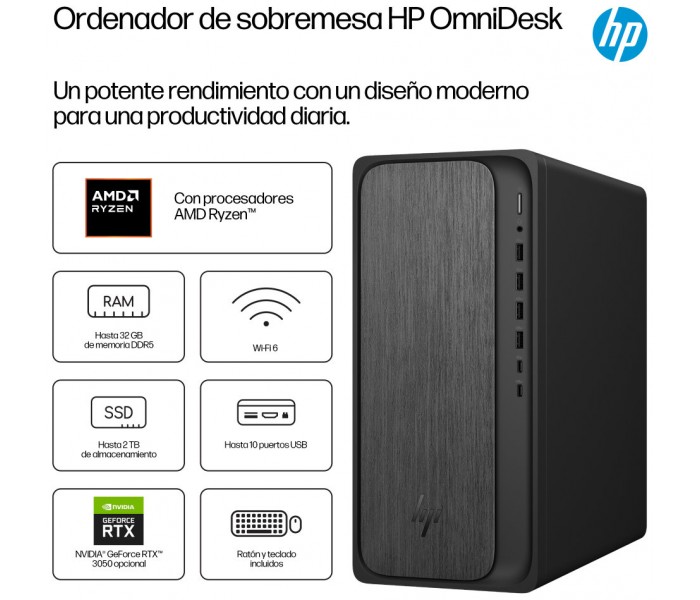 Obtén un rendimiento equilibrado y gráficos con gran capacidad de respuesta gracias al ordenador de sobremesa HP OmniDesk, equipado con procesadores AMD Ryzen™[1]. Las capacidades opcionales de IA admiten una multitarea fluida, mientras que la memoria DDR5 reduce los tiempos de carga. Mantén la productividad con los puertos más recientes, incluido USB-C[4], y gráficos opcionales para unas imágenes inmersivas.