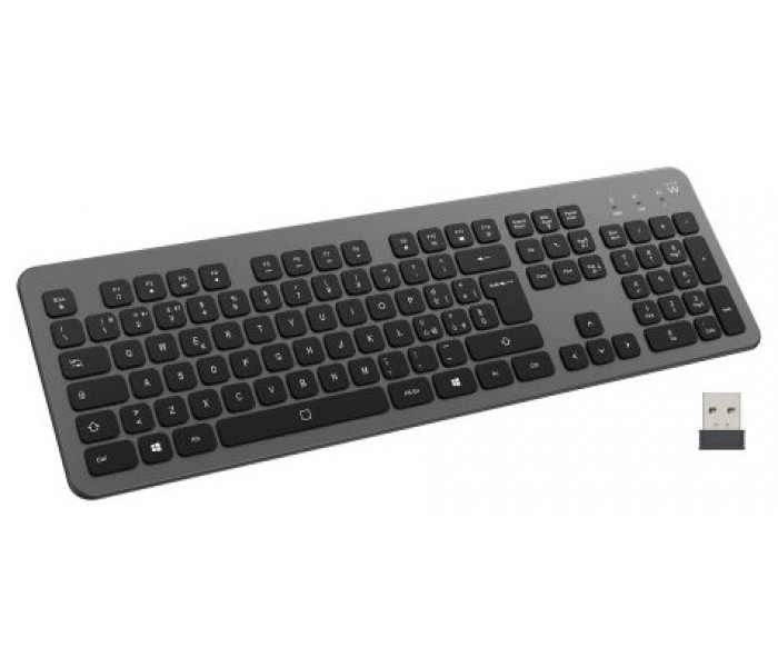 El teclado inalámbrico Ewent EW3296 incorpora tecnología Bluetooth y conexión inalámbrica 2.4G, permitiendo conectar hasta tres dispositivos simultáneamente y cambiar entre ellos con un botón dedicado. Es compatible con PCs con Windows, portátiles y dispositivos Android.