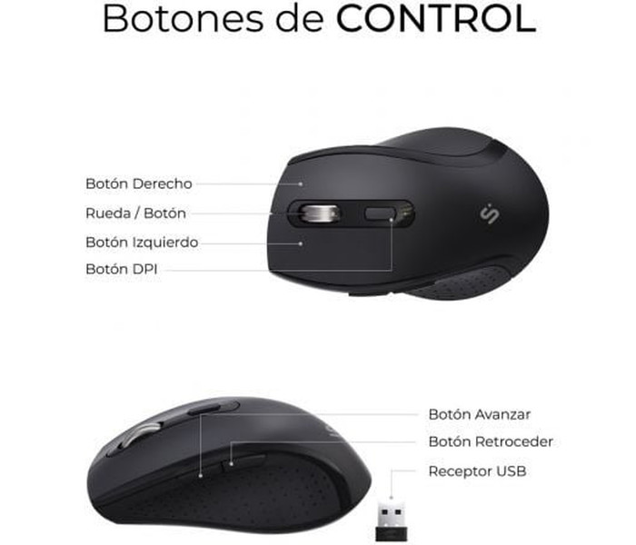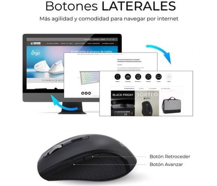 Ratón Ergo Inalámbrico. El pack se completa con un ratón ergonómico, pensado para adaptarse a la perfección a la mano derecha. Dispone de botones laterales de “Avanzar” y “Retroceder” y un tacto suave con clic silencioso. Además, puedes ajustar su DPI entre 800/1200/1600/3200 para obtener la sensibilidad y precisión que mejor se ajuste a tu estilo de trabajo o juego.