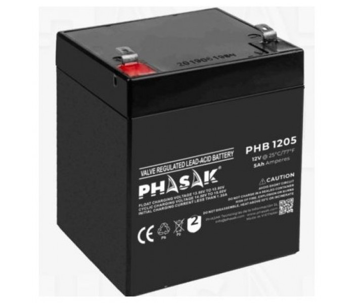 La PHASAK PHB 1205 es una batería sellada de plomo-ácido de 12 V y 5 Ah de capacidad, diseñada para sistemas de alimentación ininterrumpida (SAI/UPS), telecomunicaciones y otras aplicaciones críticas. Su construcción libre de mantenimiento y su diseño compacto la hacen fiable, eficiente y de instalación sencilla.